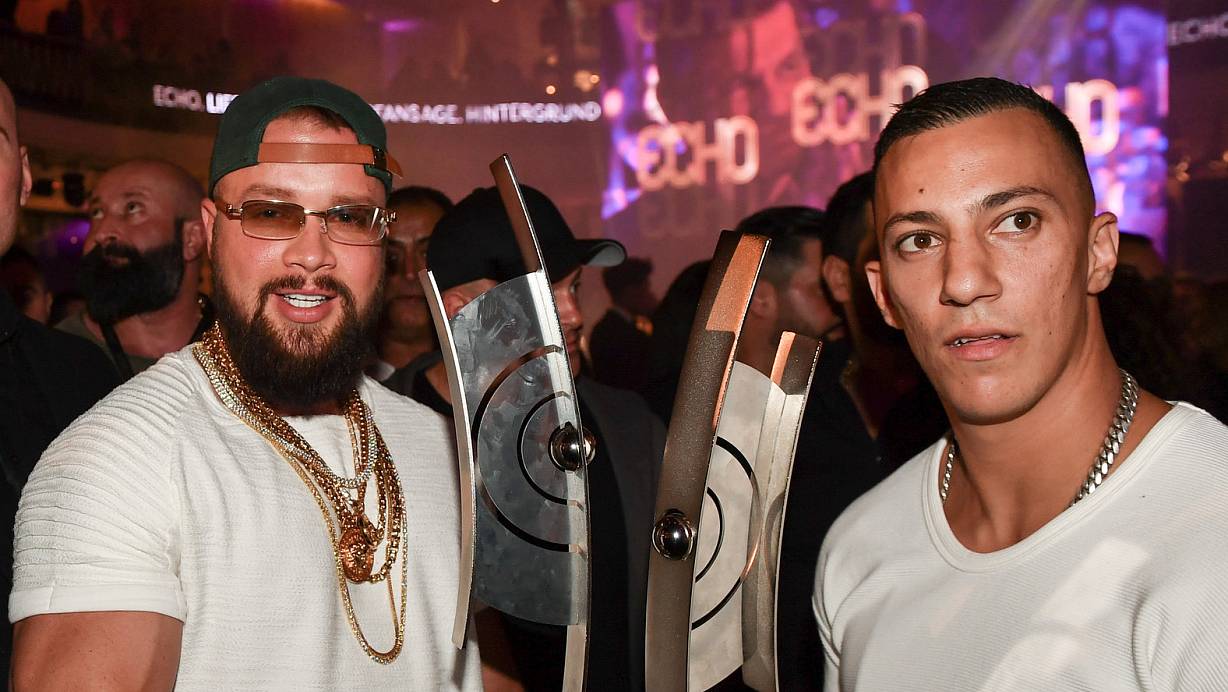 Die Rapper Kollegah (l.) und Farid Bang feiern auf der Party nach der 27. Verleihung des Deutschen Musikpreises Echo. | © picture alliance / Jens Kalaene/dpa-Zentralbild/dpa