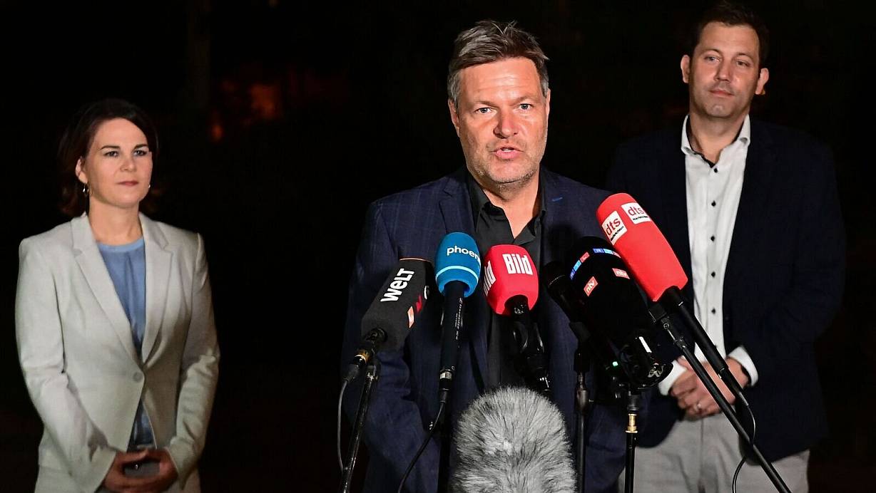 Grünen-Chef Robert Habeck (M.), Grünen-Chefin Annalena Baerbock (l.) and SPD-Generalsekretär Lars Klingbeil (r.) nach dem Sondierungsgespräch ihrer Parteien. | © AFP