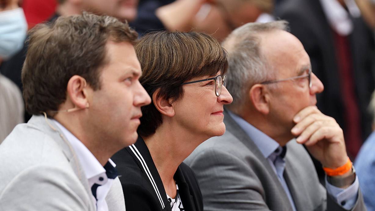 Lars Klingbeil, Saskia Esken und Norbert Walter-Borjans beim Wahlkampfabschluss der SPD für die Bundestagswahl 2021 auf dem Heumarkt. | © picture alliance / Geisler-Fotopress | Christoph Hardt/Geisler-Fotopres
