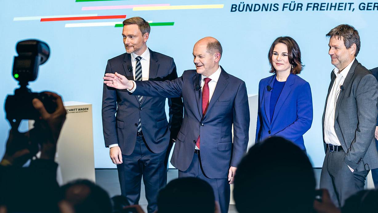 Christian Lindner (v.l., FDP), Olaf Scholz (SPD), Annalena Baerbock (Buendnis 90 Die Gruenen) und Robert Habeck (Bündnis 90/Die Gruenen) wollen zukünftig gemeinsam regieren. | © picture alliance / photothek
