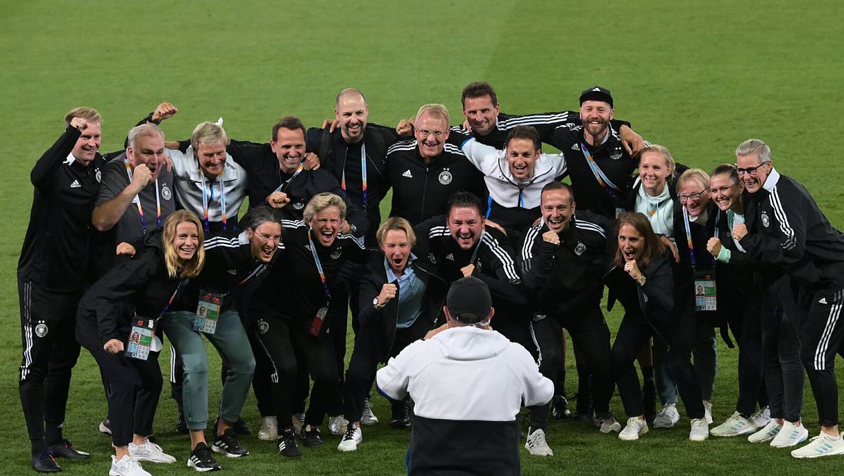 Bundestrainerin Martina Voss-Tecklenburg (M) und das Trainerteam jubeln nach Spielende. | © Sebastian Gollnow/dpa
