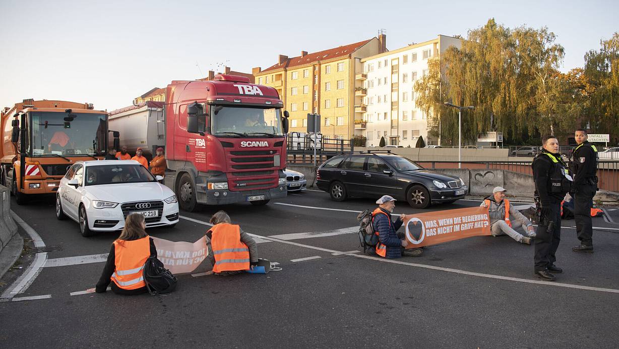 Mitglieder der Umweltschutzgruppe „Letzte Generation“ blockieren eine Autobahnausfahrt am Spandauer Damm. | © Paul Zinken