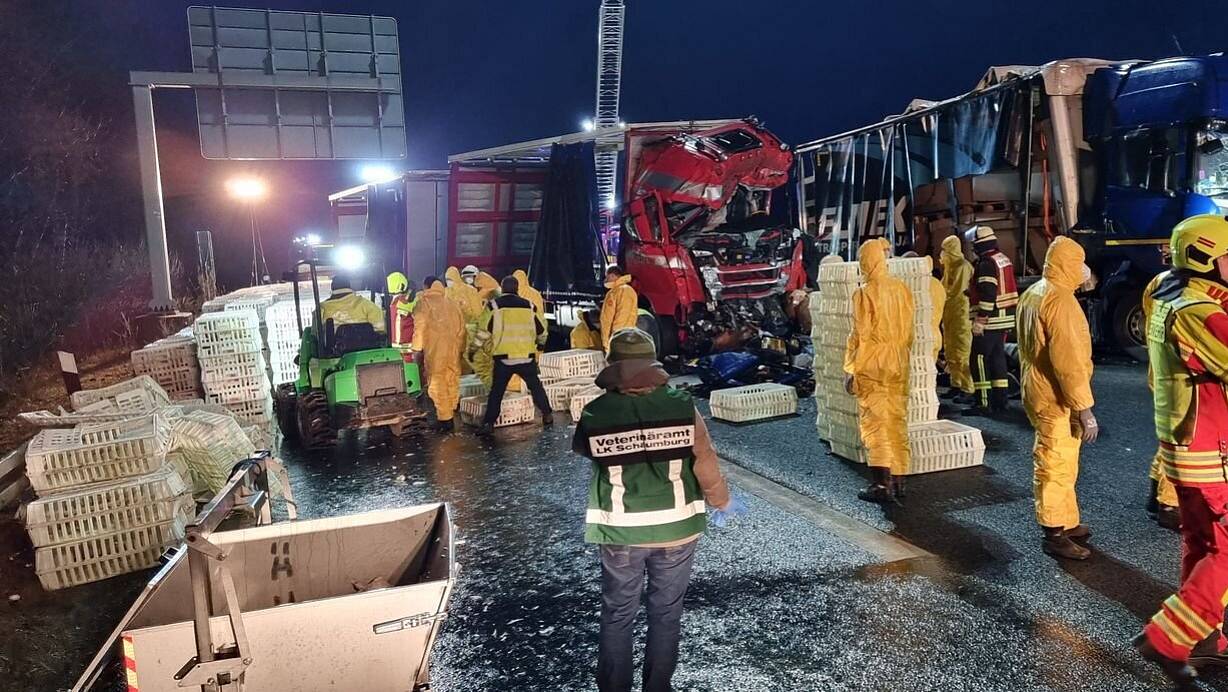 Im Rückstau des Unfalls stießen zwei weitere Lkw mit dem Transporter voller Hühner zusammen. Dabei wurden drei Männer im Alter von 34, 35 und 46 Jahren schwer verletzt. Sie wurden ins Krankenhaus gebracht.
