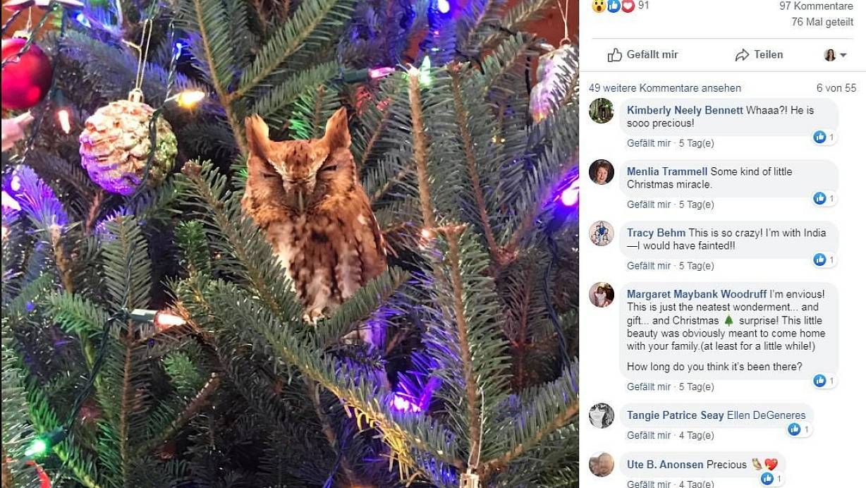 Katie Mcbride Newman hat am vergangenen Freitag einen Beitrag auf Facebook geteilt mit einem Foto einer Eule, die auf einem Zweig ihres Weihnachtsbaums sitzt. Ist das überhaupt möglich? Zahlreiche Kommentatoren waren begeistert und sprechen von "einem kleinen Weihnachtswunder" oder einem "magischen" Glücksfall. Newman erklärt, dass ihre Tochter India den Vogel im Baum entdeckt habe. Sie habe sich sehr erschrocken, als sie bemerkt habe, dass die Eule ihren Kopf bewegt habe.
