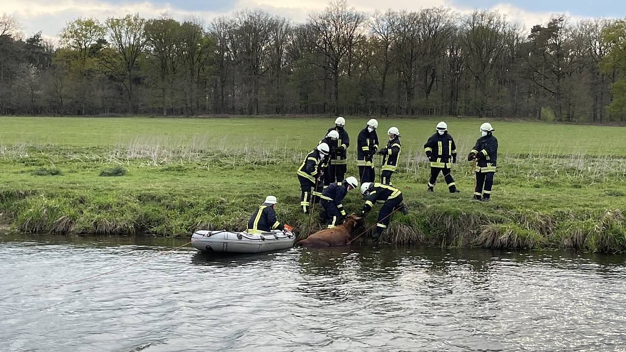Für eine Überlebenschance der Kuh habe die Geburt dringend abgeschlossen werden müssen, erklärte die Feuerwehr. Unter den Einsatzkräften waren demnach auch fachkundige Landwirte, die das tote Jungtier entbanden. Die Kuh habe sich letztlich von den Strapazen erholt. Im Einsatz waren rund 30 Feuerwehrleute.