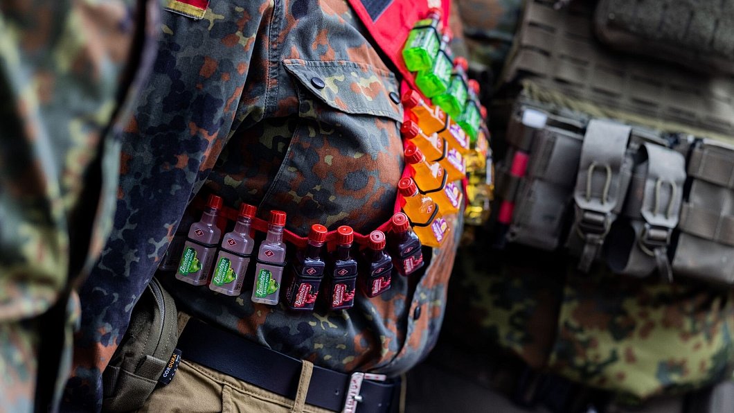Leon hat sich aufmunitioniert. Zwei Patronengürtel kreuzen sich auf seiner Brust, dazu trägt er Flecktarn-Klamotten - in dem braun-beige-grünen Muster, in das sich Soldaten hüllen. Wenn man genauer hinschaut, sieht man allerdings, dass in den Gürteln keine Munition steckt, die man verschießen kann - sondern nur in sich reinschütten. Es sind viele kleine Schnaps-Flaschen.