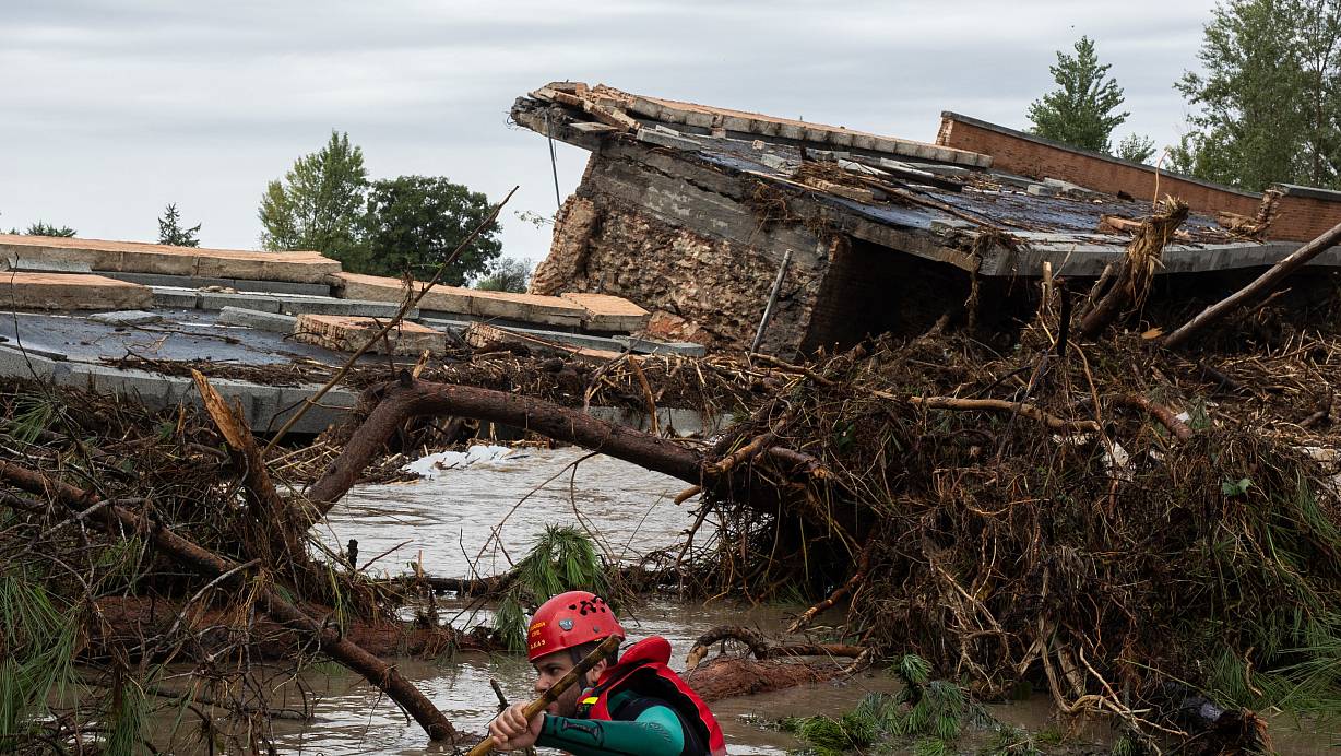 Ein Beamter der Guardia Civil sucht nach Vermissten an der Pedrera-Brücke in Aldea del Fresno, Madrid, die aufgrund des Hochwassers des Flusses Alberche eingestürzt ist. | © dpa