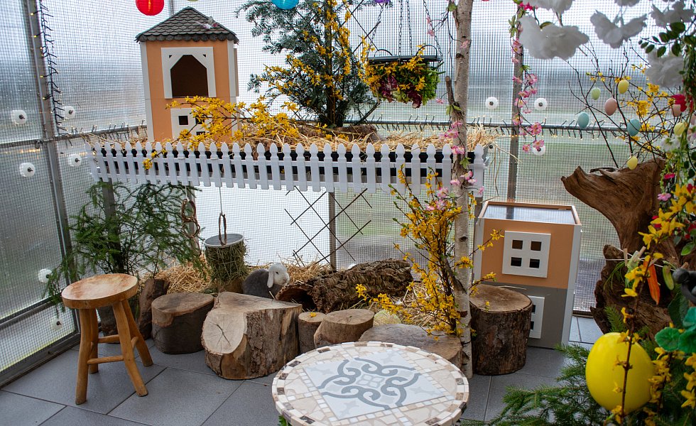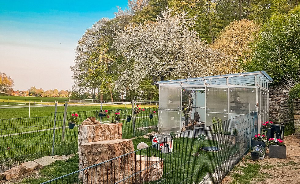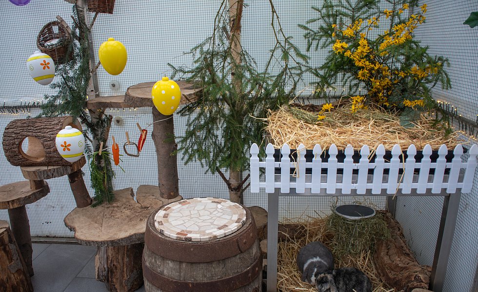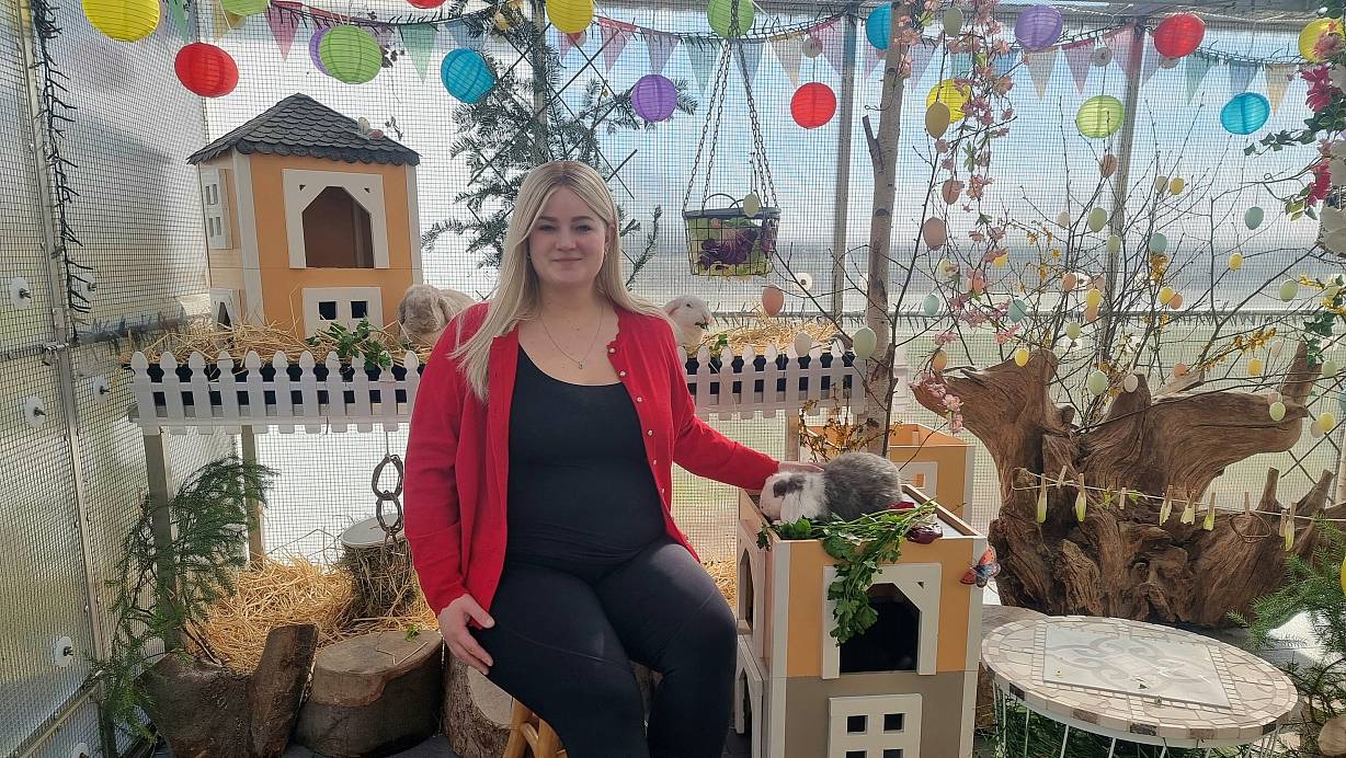 Mariel Kempa ist wichtig, dass ihre Schützlinge „ganz Kaninchen sein“ können. Wenn zu Weihnachten ein Häuschen in Pfefferkuchenoptik bereitsteht oder wie jetzt zu Ostern bunte Eier an Sträuchern in ihrem Zuhause hängen, dann ist das natürlich vor allem schön fürs menschliche Auge. Von den gelben Forsythien in ihrem Gehege haben aber auch sie etwas. „Die mögen sie besonders gern“, sagt Kempa.