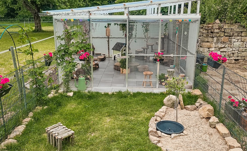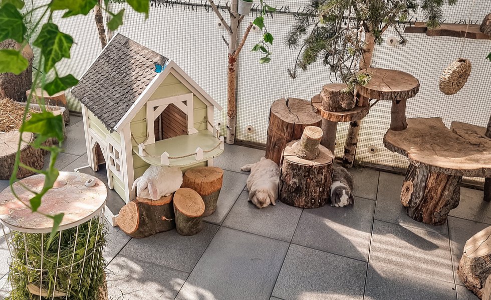 Hasenkaninchen „Tivoli“ und die Zwergkaninchen „Putty“, „Lilo“, „Campino“, „Ket“ und „Tesla“ können nicht nur auf 40 Quadratmetern draußen herumlaufen, wie es ihnen passt. Sie bewohnen auch ein 20 Quadratmeter großes, wind- und wettergeschütztes Gehege, in dem viel Arbeit steckt. „2019 haben wir mit der Gestaltung begonnen, 2021 war das meiste gebaut“, erklärt die 26-jährige Physik-Doktorandin.