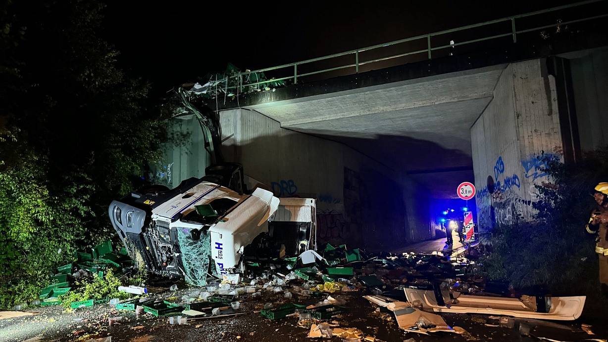 Der Lastwagen war nach Polizeiangaben links und rechts gegen die Leitplanken gefahren, stürzte auf die Seite und verstreute seine Weintrauben-Ladung über mehrere hundert Meter auf der A2. Die Zugmaschine löste sich vom Auflieger und stürzte samt Fahrer von der Autobahnbrücke. Der behandelnde Notarzt wunderte sich laut Polizei darüber, dass dem Mann nicht mehr passiert ist. Er musste nicht reanimiert werden, kam aber ins Krankenhaus. Der Auflieger blieb oben auf der A2 liegen.