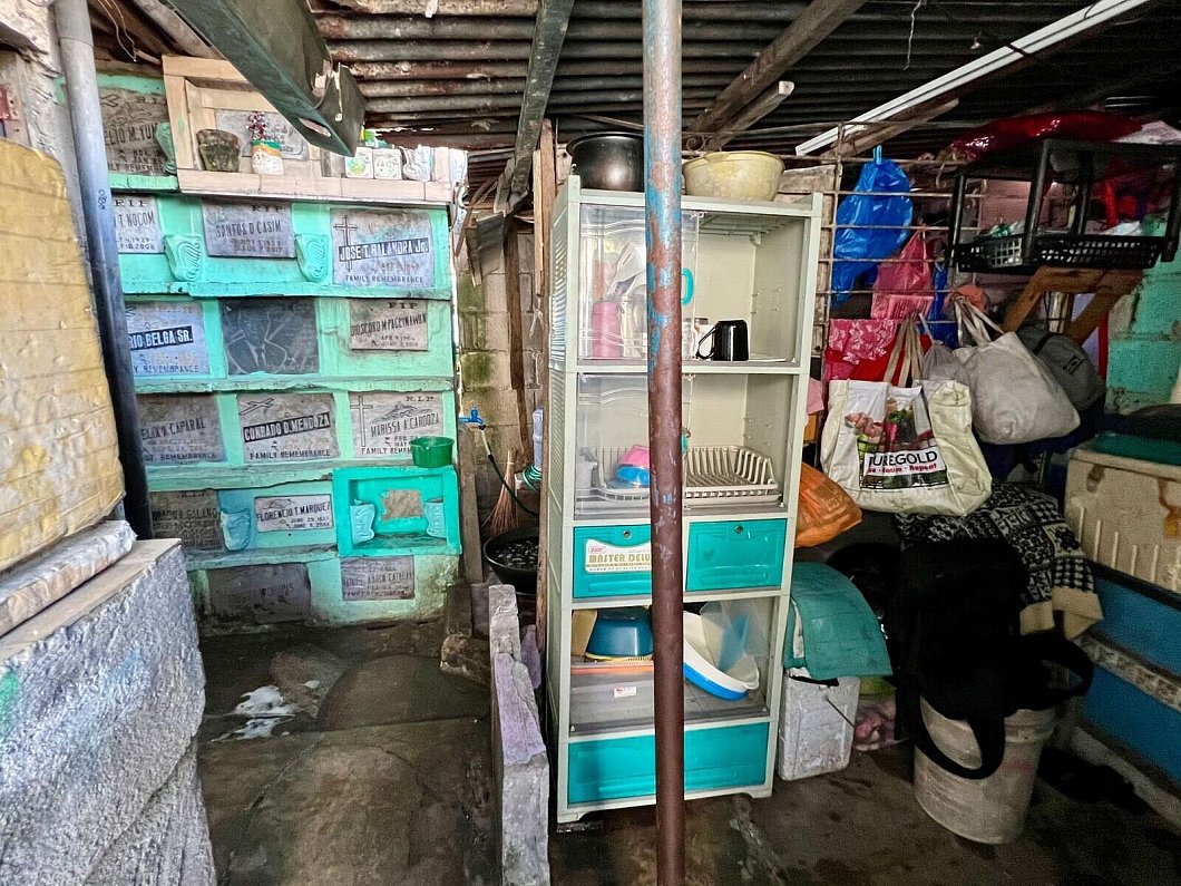 Auch Marilyn (47) und ihre Familie haben tagelang die Grabstätte geputzt und hergerichtet, die sie ihr Zuhause nennen. Es handelt sich um eine Art Hütte, an deren hinterer Seite der himmelblaue Beton-Sarg thront. Darauf und daneben liegen Matratzen und Kissen. Aus einer Ausbuchtung an der Kopfseite ragt ein Kamm. Ventilatoren surren und sorgen für Abkühlung von der Tropenhitze Südostasiens. Ein großer Grabstein liegt quer vor einem Loch und soll Ratten fernhalten. R.I.P. (kurz für «Rest in Peace») steht auf der ausrangierten Marmorplatte. Das Ehepaar, der sie einst gewidmet wurde, ist schon seit Jahrzehnten tot.