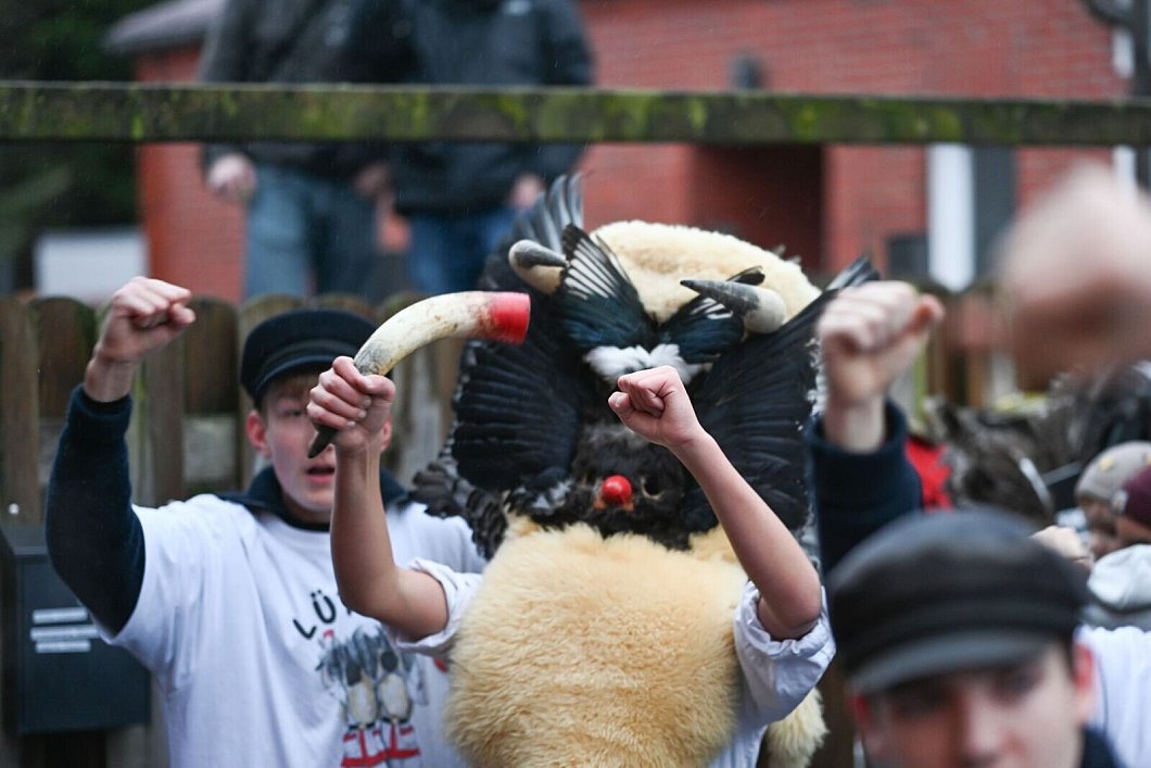 Zum Auftakt des Festes am Nachmittag war die Stimmung auf den Straßen ausgelassen. Zuerst wurden die Klaasohms von Borkumerinnen und Borkumern an ihren Vereinslokalen abgeholt und zu einer Halle geführt - begleitet von lautem Tuten mit Hörnern. Viele Teilnehmer hatten Kuhhörner dabei.