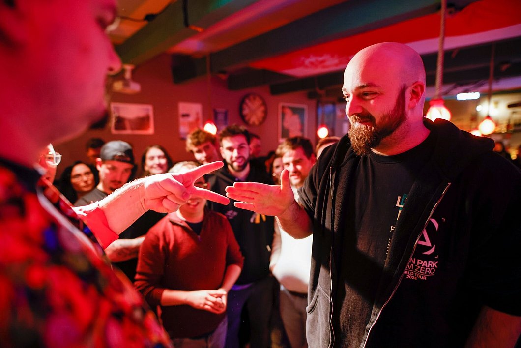 «Rollender Stein» schaut seinem Gegner «Peach B» tief in die Augen. Dann formt er seine Hand zu einer Faust. Er führt 2:0, Matchball, die nächste Runde kann das Spiel entscheiden. Um die beiden Spieler auf dem Podest herum steht eine Schar Menschen. Es wird laut gerufen, Spielgeldscheine für Wetten landen auf dem Kampfteppich. Die Atmosphäre erinnert an einen Boxkampf.