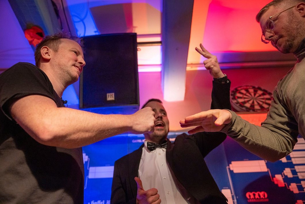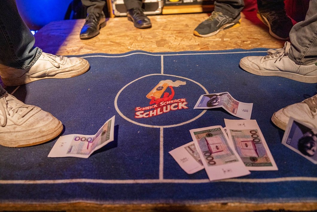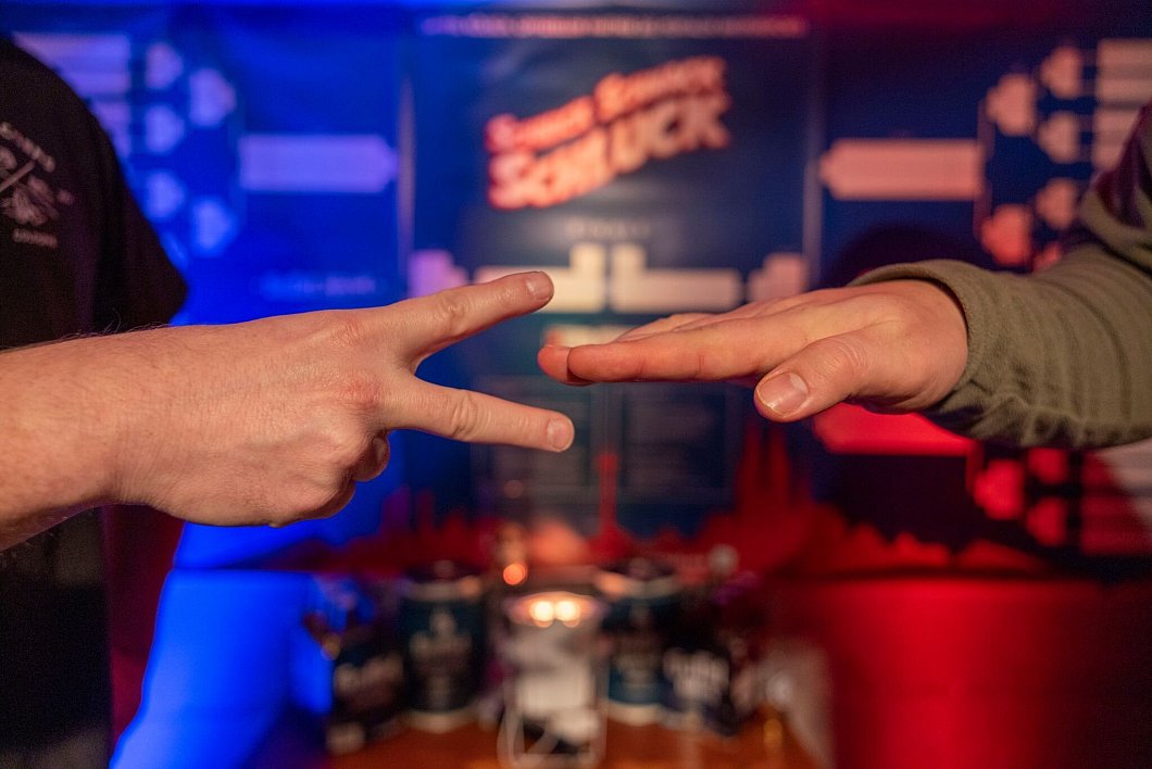 Mit 3:0 zieht er weiter ins Achtelfinale des «Schere, Stein, Papier»-Turniers. Der Wettbewerb wird unter dem Namen «Schnick Schnack Schluck» neunmal pro Jahr in Kölner Kneipen ausgetragen, an diesem Abend geht es im «Kwatier» um den achten Weltcup. Am Ende des Jahres wird der Spieler mit den meisten Punkten zum Weltmeister gekürt. Das Finale findet am 19. Dezember in der Kölner Kultkneipe «Stiefel» statt.