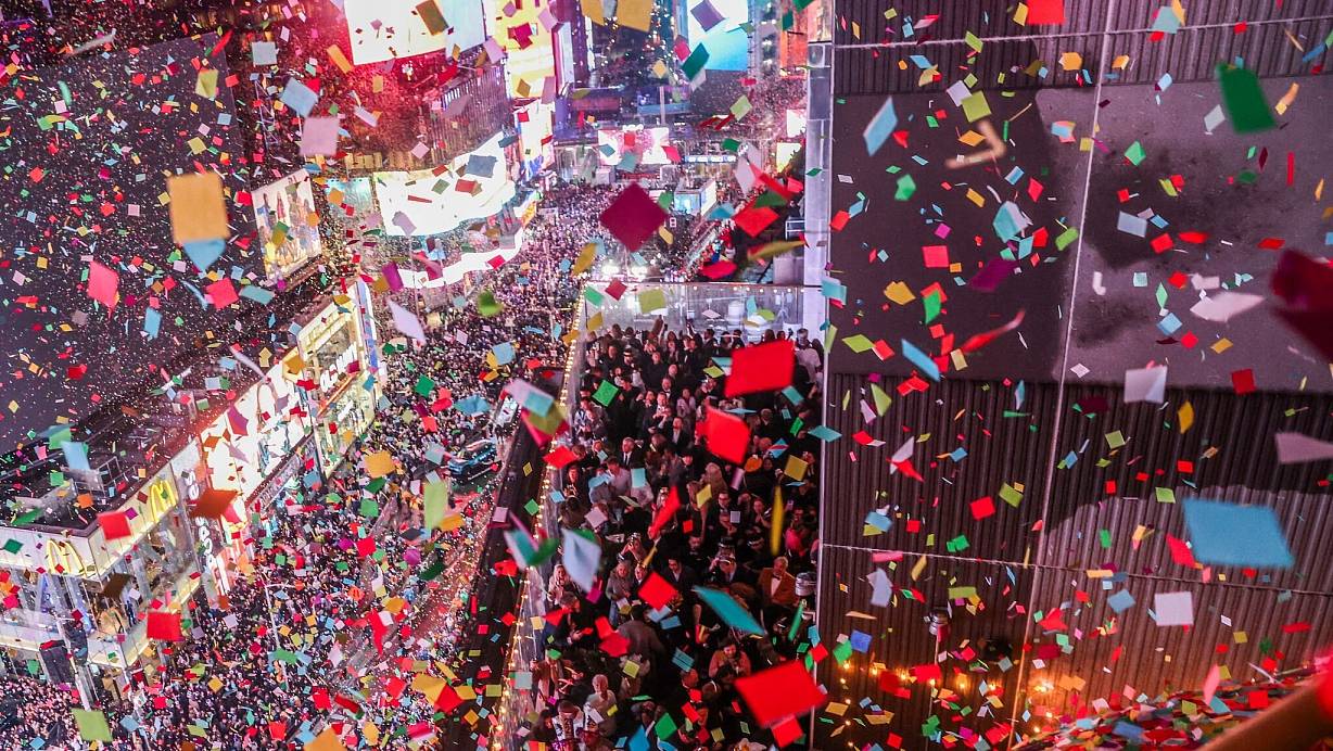 Hunderttausende Menschen haben auf dem weltberühmten Times Square in New York ins neue Jahr gefeiert. Um Mitternacht richteten sich wie in jedem Jahr alle Augen weit nach oben: Um 23.55 Uhr erklang der John-Lennon-Song «Imagine», und um 23.59 Uhr fuhr vom Dach des 26-stöckigen Hochhauses Times Square One an einer speziellen Stange eine fast 5.400 Kilogramm schwere Kugel, verziert mit 2.688 Kristall-Dreiecken, rund vierzig Meter nach unten - bis exakt um Mitternacht.