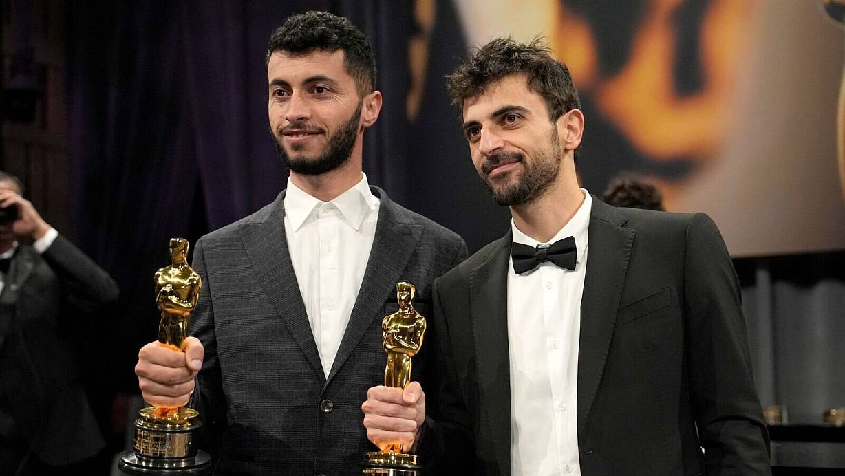 Die Regisseure Basel Adra und Yuval Abraham nutzten die Bühne in Los Angeles, um auf die Situation in ihrer Region hinzuweisen.