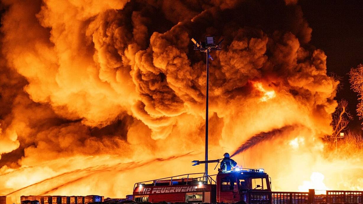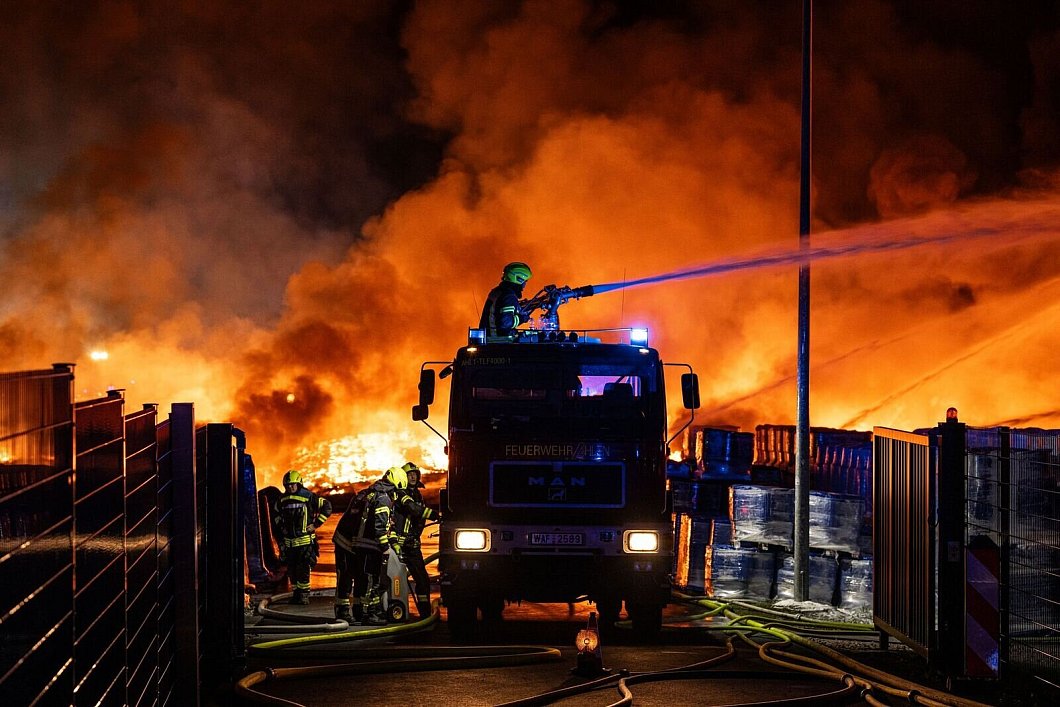 Noch habe die Feuerwehr den Bereich aber nicht freigeben, sodass die Brandermittler ihre Arbeit bislang nicht aufnehmen konnten, sagte eine Polizeisprecherin. Auch zur Höhe des Schadens sei noch keine Auskunft möglich. Insgesamt war auf einer Fläche von rund 7.000 Quadratmetern ein Feuer ausgebrochen. Drei Hallen einer Firma, die Kunststoff verarbeitet, standen in Flammen. Auch auf eine benachbarte Firma hatte das Feuer übergegriffen.