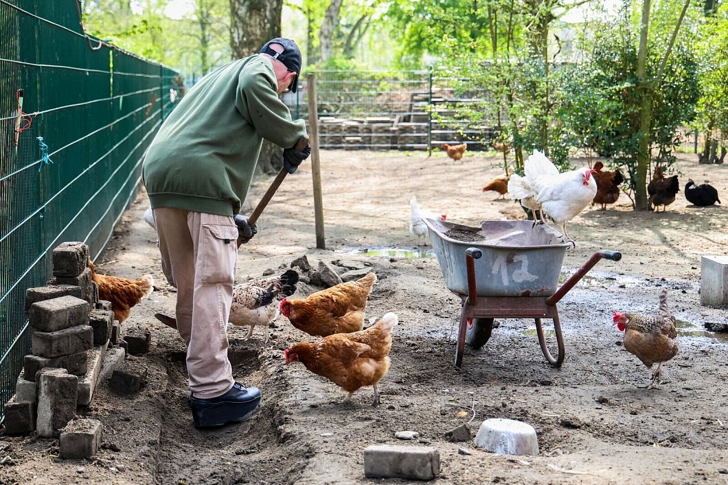 Häftling Marco (42) rückt gerade dem Lehmboden zu Leibe - neben ihm verfolgen das neugierige Hühner auch vom Schubkarrenrand aus. «Ich bin zu 80 Prozent schwerbehindert und habe gedacht, mir mein Leben mit mehreren Betrugssachen leichter finanzieren zu können.» Er bereue das. «Die Arbeit mit den Hühnern ist kreativ und macht mir viel Spaß. Wenn ich wieder draußen bin, sehe ich einige Möglichkeiten, vielleicht im Tierheim oder im Zoohandel.»