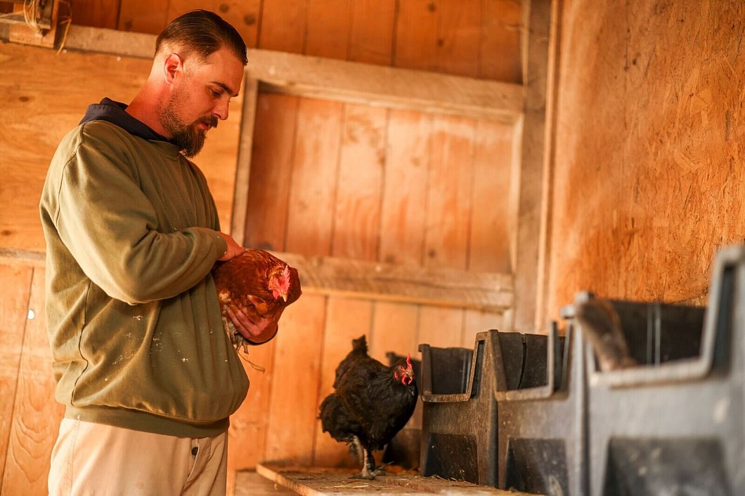 Ryan hatte draußen null Bezug zu Hühnern. «Aber ich liebe Tiere und unter den gegebenen Umständen ist es der perfekte Job für mich», erzählt der seit gut zwei Monaten Inhaftierte. Um 06.40 Uhr geht’s los: Futter verteilen, Wasser austauschen. «Alle ein, zwei Wochen säubern wir die Ställe, nicht allzu oft, das haben die Hühner nicht gern.» Auch Streicheleinheiten fallen ab.