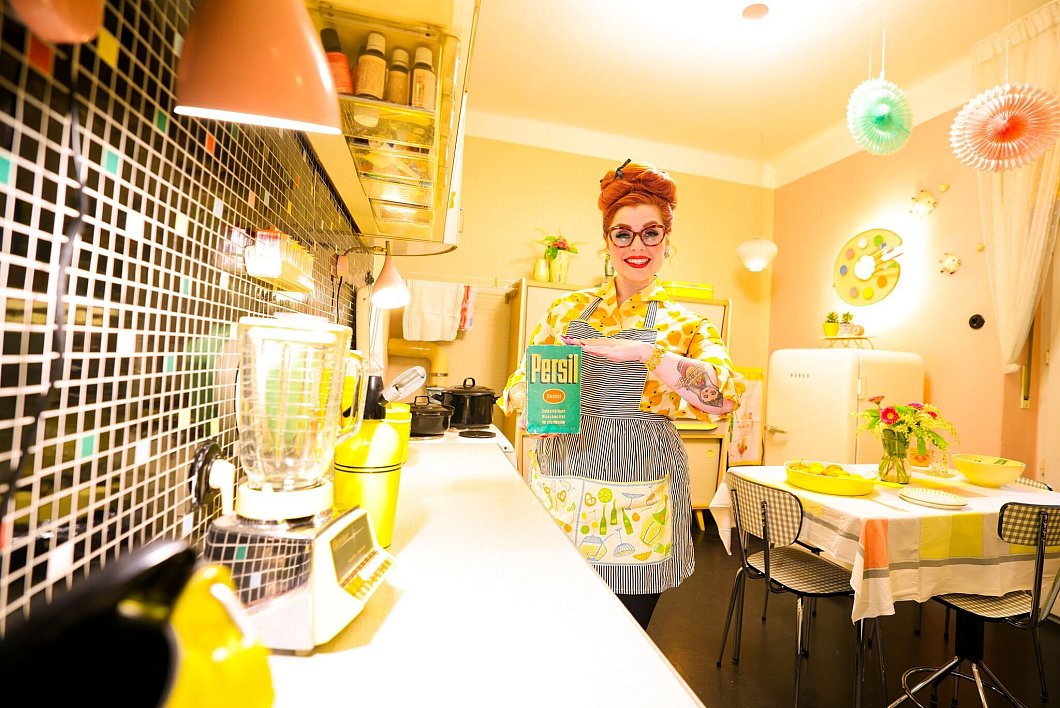 Ein Telefon mit Kabel und Wählscheibe oder auch eine alte Flimmerkiste mit Fernsehbildern in Schwarz-Weiß gehören zum Haushalt. Die Kleiderschränke platzen fast - Klamotten aus den 60er Jahren leuchten in Gelb, Grün oder Pink durch die Glasfronten. Passende Schuhe, Hüte und Modeschmuck stapeln sich.