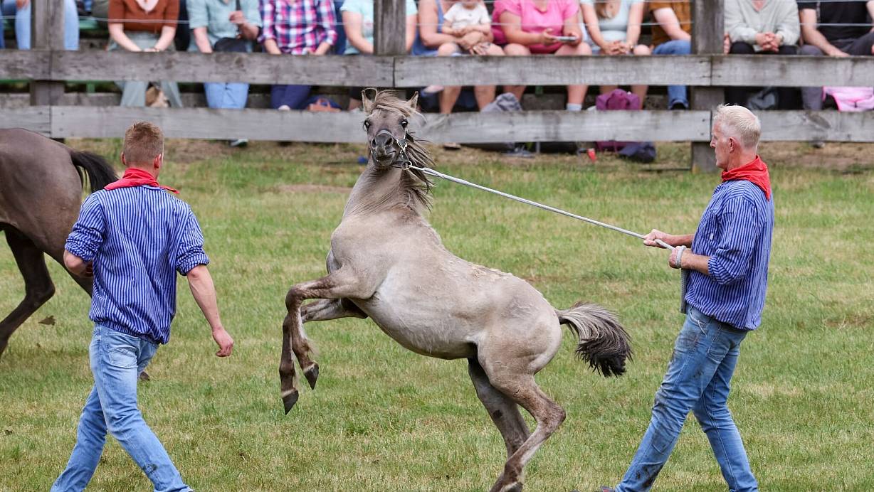Beim traditionellen Jungpferdefang im Naturschutzgebiet Merfelder Bruch im Münsterland sind am Samstag 26 Junghengste von der Herde getrennt worden. Nach dem Fang werden die Hengste versteigert. Rudolf Herzog von Croÿ, der Besitzer, finanziert damit unter anderem den Erhalt der Herde. In dem Naturschutzgebiet bei Dülmen lebt eine freilebende Herde mit rund 400 Wildpferden.