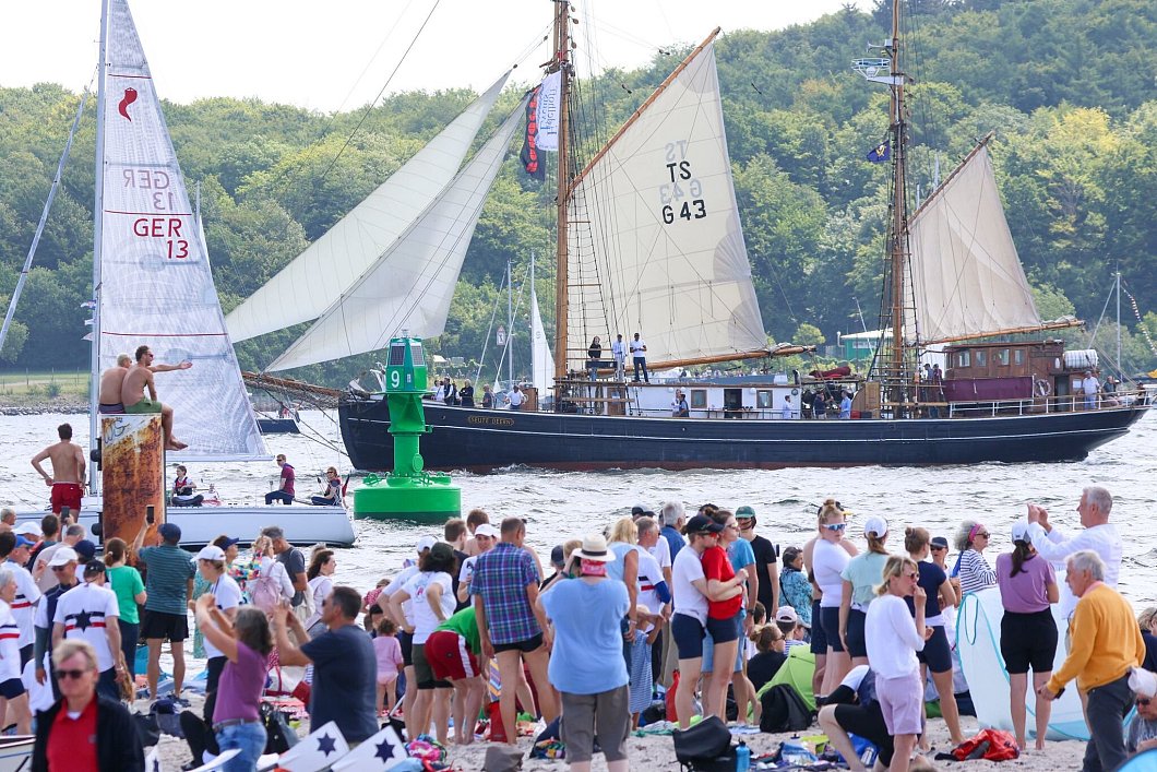 Menschen beobachteten das Spektakel auf dem Wasser nicht nur von Land aus, sondern auch von zahlreichen Booten auf dem Wasser. Die Segelparade gilt als maritimer Höhepunkt der am Sonntagabend endenden Kieler Woche.