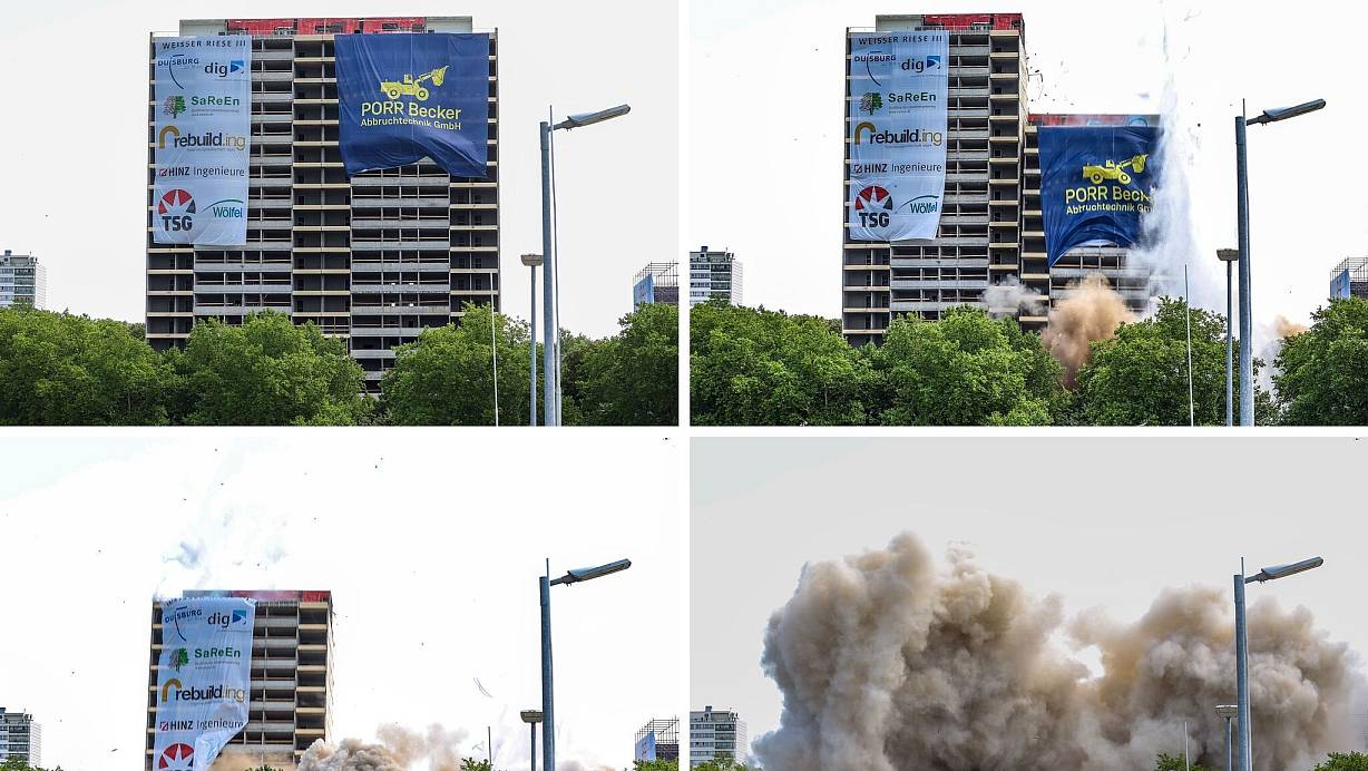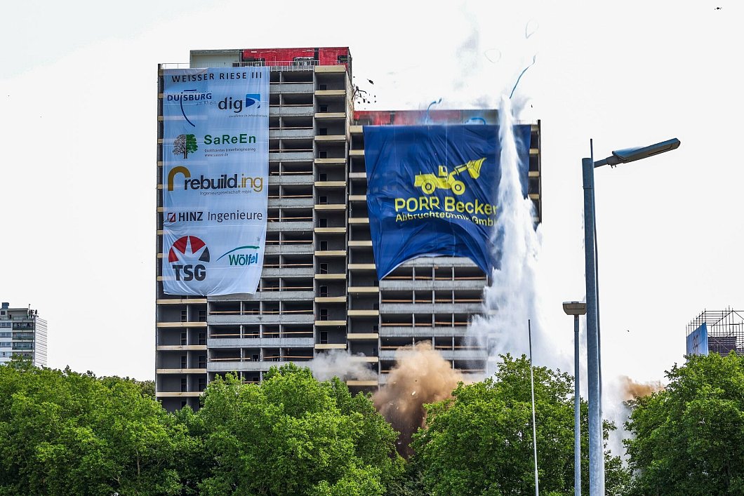 Mit einer gewaltigen Detonation ist in Duisburg ein weiterer «Weißer Riese» gefallen. Das mehr als 60 Meter hohe Gebäude mit seinen einst 160 Wohnungen wurde am Sonntag planmäßig um 12.00 Uhr zum Einsturz gebracht. Eine erste Sprengung brachte das Gebäude zum Kippen, eine zweite dann zum Kollabieren. Komplikationen gab es der Stadt zufolge nicht.