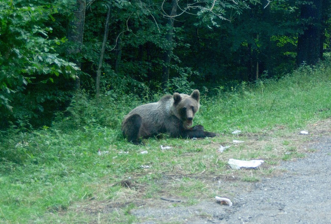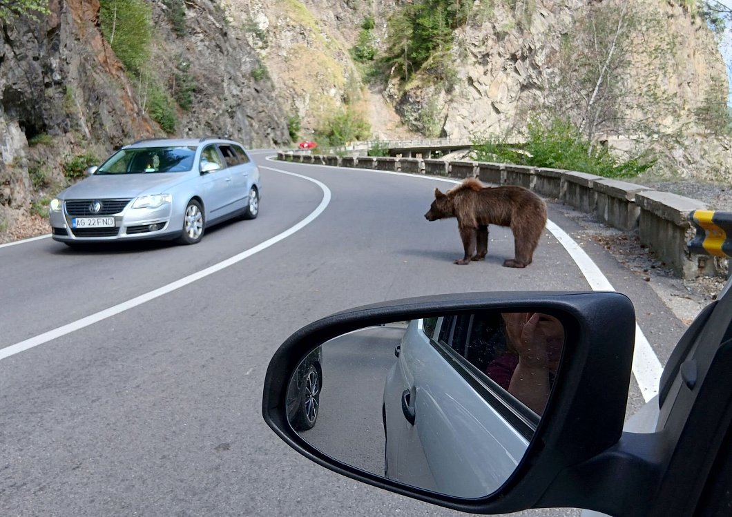 In der Parkbucht am Transfagarasan nahe dem Ort Arefu bleiben drei Autos stehen, darunter eines mit einer Reporterin der dpa. Ein Tourist wirft dem Bären eine Banane zu, obwohl Dutzende unübersehbare Schilder der Behörden das Bärenfüttern verbieten. Der Bär schnuppert an der Banane, lässt sie aber liegen. Dann tapst er wieder zurück in den Wald. Wenige Kilometer weiter brät jemand Schoko-Crêpes an einem Kiosk, der nachts mit einem elektrischen Zaun vor Bären geschützt wird.