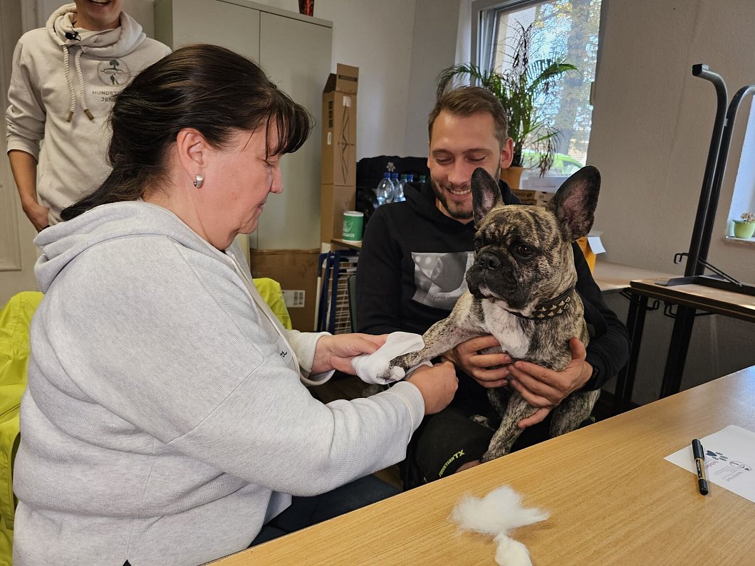 Thomas Frömmig hat mit seiner französischen Bulldogge Buddy schon mehrere Notsituationen erlebt. Buddy hatte etwa auf einer Wespe gekaut, daraufhin schwoll sein Kopf an. «Ich bin natürlich sofort zum Tierarzt gefahren, der dann helfen konnte», erzählt der Hundehalter. Für Buddy hatte er schon vor dem Kurs immer ein Erste-Hilfe-Set dabei.