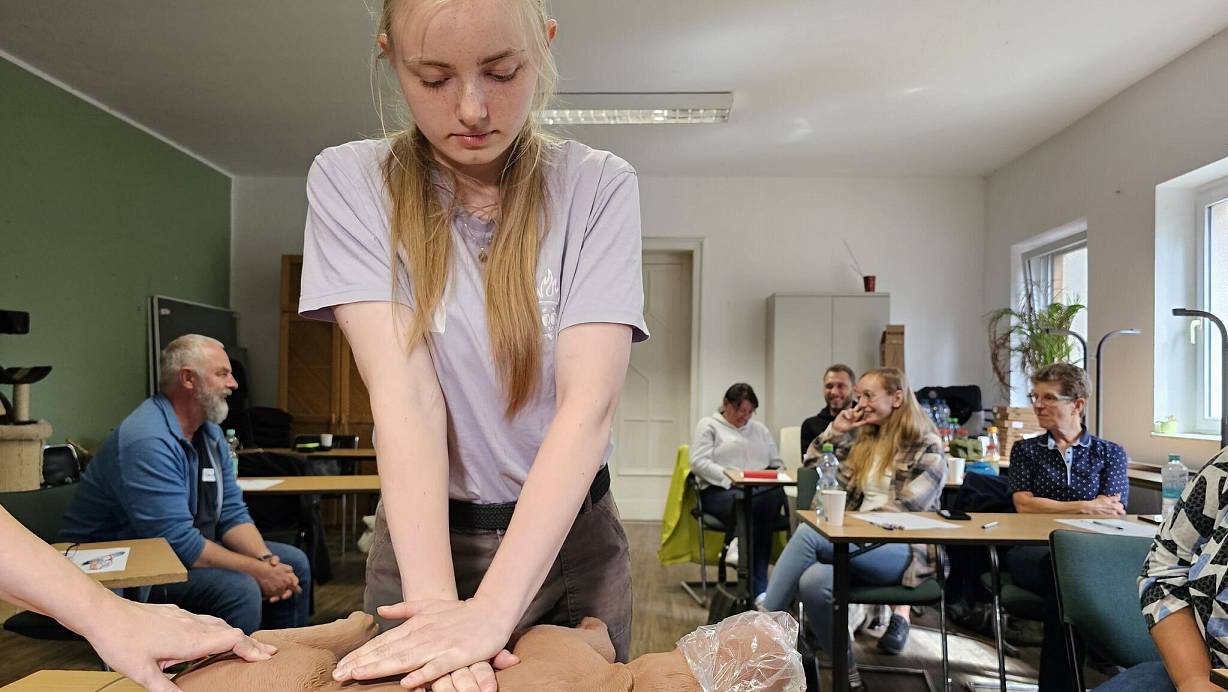 In Halle zeigt Meintschel gemeinsam mit Hundetrainer Jens Bach Besitzerinnen und Besitzern von Hunden auch, was sie dabeihaben sollten, um möglichst gut helfen zu können. Die Halter werden geschult, wie sie sich im Notfall zu verhalten haben. Zum Kurs gehört nicht nur Theorie, sondern auch Praxis. Es werden Pfoten verbunden, Hunde-Dummys wiederbelebt und Erste-Hilfe-Koffer auseinandergenommen.