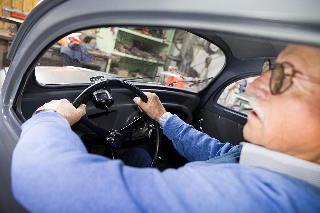 Vor allem aber ist es beengt in dem Fahrzeug. «Früher waren die Menschen eben kleiner.» Wer gut 1,80 Meter groß ist, bekommt bereits Probleme, seine Beine unter dem Lenkrad hindurch zu strecken. Bei Grundmann klappt es noch. Aber um aus der Frontscheibe zu schauen, muss auch er einen Buckel machen.