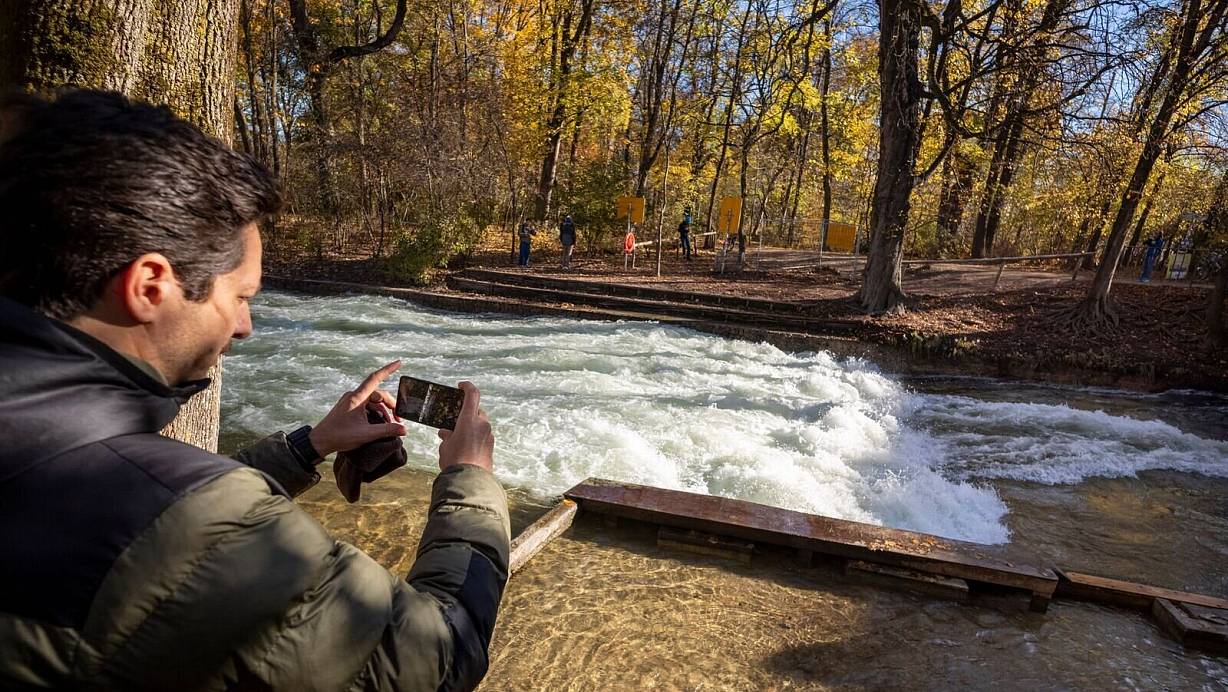 Freizeitsurfer Alexander Neumann fotografiert die - zurzeit nicht funktionstüchtige - Eisbachwelle im Englischen Garten. | © Peter Kneffel/dpa