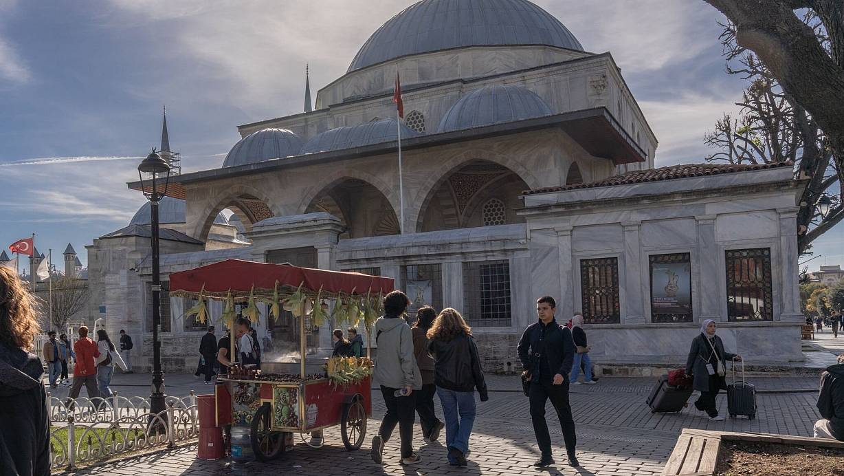 Menschen gehen an einem Straßenimbiss vor der Hagia Sophia im Viertel Sultanahmet, dem historischen Zentrum Istanbuls, vorbei. | © Ahmed Deeb/
