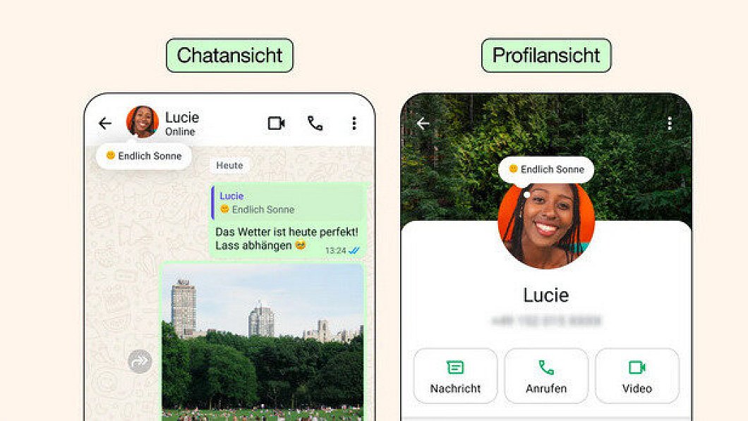 Das im Profil und in Einzelchats sichtbare Profilbild lässt sich nun mit einem Emoji und einem kurzen Satz versehen – etwa um mitzuteilen, wie man sich fühlt oder worüber man sich gerne unterhalten möchte.