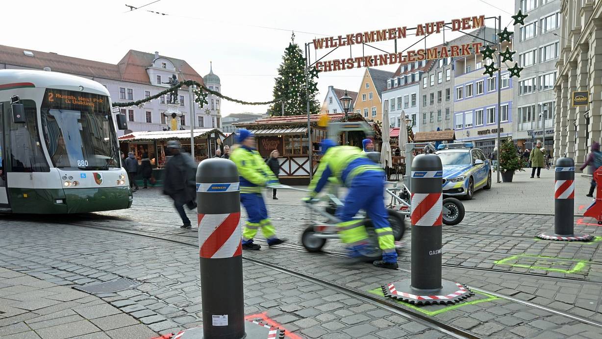 Viele Weihnachtsmärkte werden mit Sperren oder Pollern geschützt. In Augsburg mit viel Aufwand: Zum Schutz des Christkindlesmarkts gegen Anschläge mit Autos werden Sicherheitsleute bis Heiligabend tausendfach schwere Poller hin und her bewegen müssen. Die Stadt sperrt mit den Pollern die Zufahrten zu dem beliebten Weihnachtsmarkt ab.