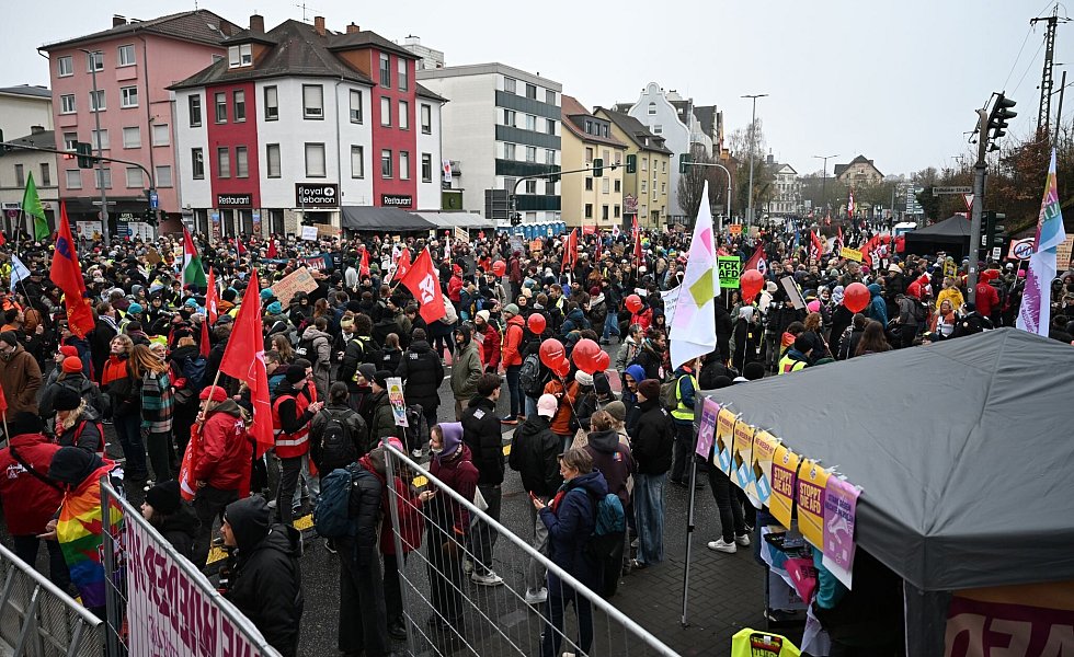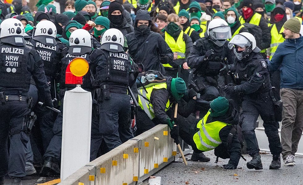 Zahlreiche Demonstranten versuchten laut Polizei, eine Polizeiabsperrung an einem Umspannwerk vor Gießen zu durchbrechen. Einsatzkräfte hätten das weitere Vordringen verhindert, dabei sei ein Beamter leicht verletzt worden. Teils seien Polizisten mit Steinen beworfen worden. Eine Sprecherin sprach von einer „aktiven Lage mit vielen verschiedenen Schauplätzen“ in der Stadt.