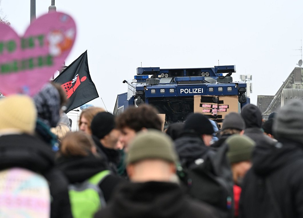 Die Polizei ist mit einem Großaufgebot und Beamten aus zahlreichen Bundesländern vor Ort, auch weil vorab Gewaltaufrufe aus der linken Szene kursierten. An einer Blockade hätten sich Beamte mit Pfefferspray gegen Steinewerfer verteidigt, ein Polizist sei leicht verletzt worden, teilte die Polizei weiter mit. Beim Stadtteil Lützellinden beschädigten Protestierende geparkte Fahrzeuge und Straßenlaternen. An einem Verkehrskreisel in der Stadt blockierte laut Polizei ein Bus mit daran angeketteten Aktivisten den Weg.