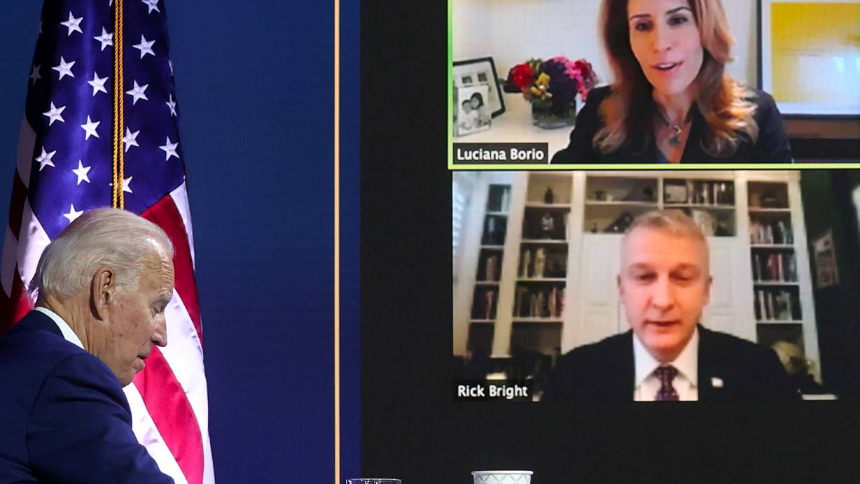 Joe Biden (l.) bespricht sich mit mit Mitgliedern seines Corona-Krisenstabs, der Ärztin und Covid-19-Expertin Luciana Borio sowie dem von Trump geschassten Ex-Direktor der US-Behörde BARDA, Rick Bright. | © REUTERS