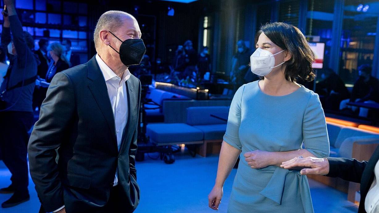 Olaf Scholz und Annalena Baerbock haben sich gemeinsam mit Armin Laschet einen Wettkampf im TV geliefert. | © dpa