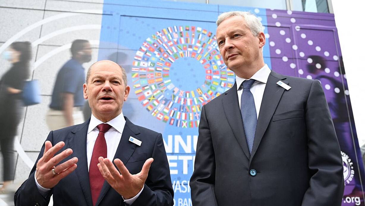 Auftritt in Washington: SPD-Kanzlerkandidat Olaf Scholz (l.) spricht mit dem französischen Finanzminister Bruno Le Maire. | © AFP