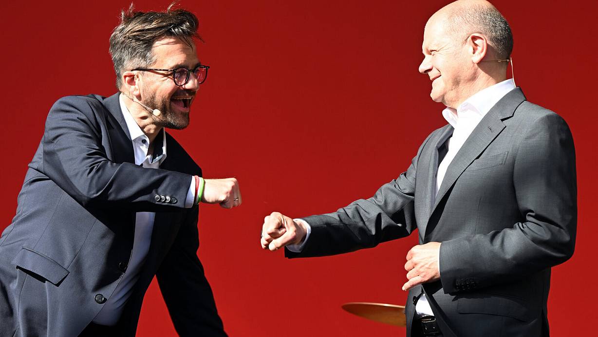 Thomas Kutschaty (l.) und Bundeskanzler Olaf Scholz (SPD) haben noch bis Samstag zusammen Wahlkampf für die SPD gemacht. | © Federico Gambarini/dpa
