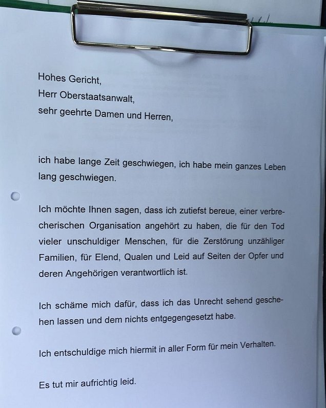 Als Nebenkläger verfolgen auch viele KZ-Überlebende und ihre Angehörigen den Prozess. Einer von ihnen, Leon Schwarzbaum, äußerte sich nach der Entschuldigung enttäuscht. „Das ist mir nicht genug. Er hat so vieles schöngeredet", sagte der 95-Jährige aus Berlin. „Es mag sein, dass er heute ein anderer Mensch ist, aber für das was war, dafür gibt es keine Entschuldigung."