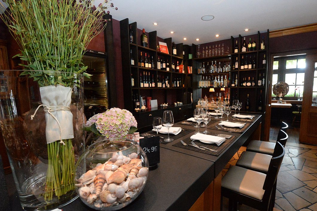 Den Durchgang beginnt man am besten in der Weinbar. Die Wände sind dunkelrot. Der Boden ist noch aus der Zeit, als die Eltern von Franz und Beate Spieker das Gasthaus führten, wie davor die Großeltern. Diese richteten vor über 80 Jahren eine Kneipe ein und einen Kolonialwarenladen, der heutzutage immer noch als Supermarkt gegenüber im Besitz der Familie Spieker ist. Franz Spieker zeigt auf einige Bilder an der Wand: "Das sind typische Szenen aus dem Kneipenbetrieb, auf den mein Vater viel Wert legte."