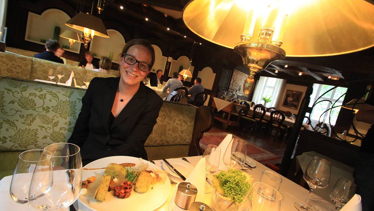Der 180.000 Quadratmeter große Komplex mit umliegenden Grünflächen lädt zum Spaziergang ein. Die Räume wiederum bieten Platz für Geburtstage, Jubiläen, Hochzeiten. "Wir haben jeden Tag mindestens drei private Veranstaltungen", sagt Nadine Kampwerth. "Das verläuft sich über die Fläche."Carina Frie und ihr Lebensgefährte Christopher Schemmink, die das Hotel seit vergangenem Jahr leiten, haben insgesamt über 90 fest angestellte Mitarbeiter. Acht davon arbeiten im Service der Restaurants.