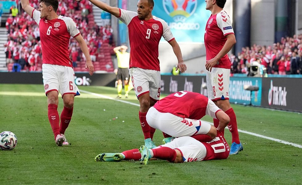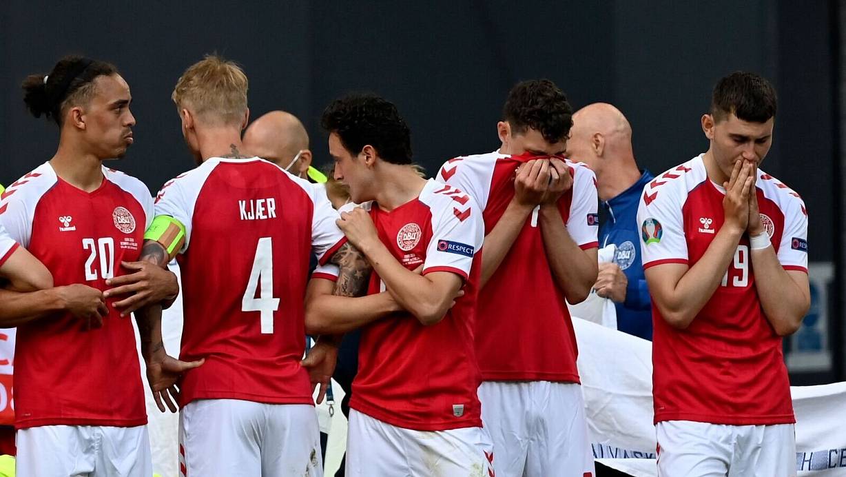 Die Aktion passierte in der 43. Minute ohne gegnerische Einwirkung. Bei einem Einwurf ging Eriksen dem Ball entgegen und sackte dann zu Boden. Die Spieler um ihn herum sahen direkt die Notlage und riefen medizinische Hilfe herbei. Danach begannen die dramatischen Minuten. Es war zu sehen, wie Rettungskräfte eine Herzdruckmassage bei ihm durchführten. Die dänischen Spieler versammelten sich teils den Tränen nahe um ihren Mitspieler. Schließlich wurde Eriksen auf einer Rettungstrage, unter Sichtschutz aus dem Innenraum des Stadions gefahren und ins Krankenhaus gebracht.