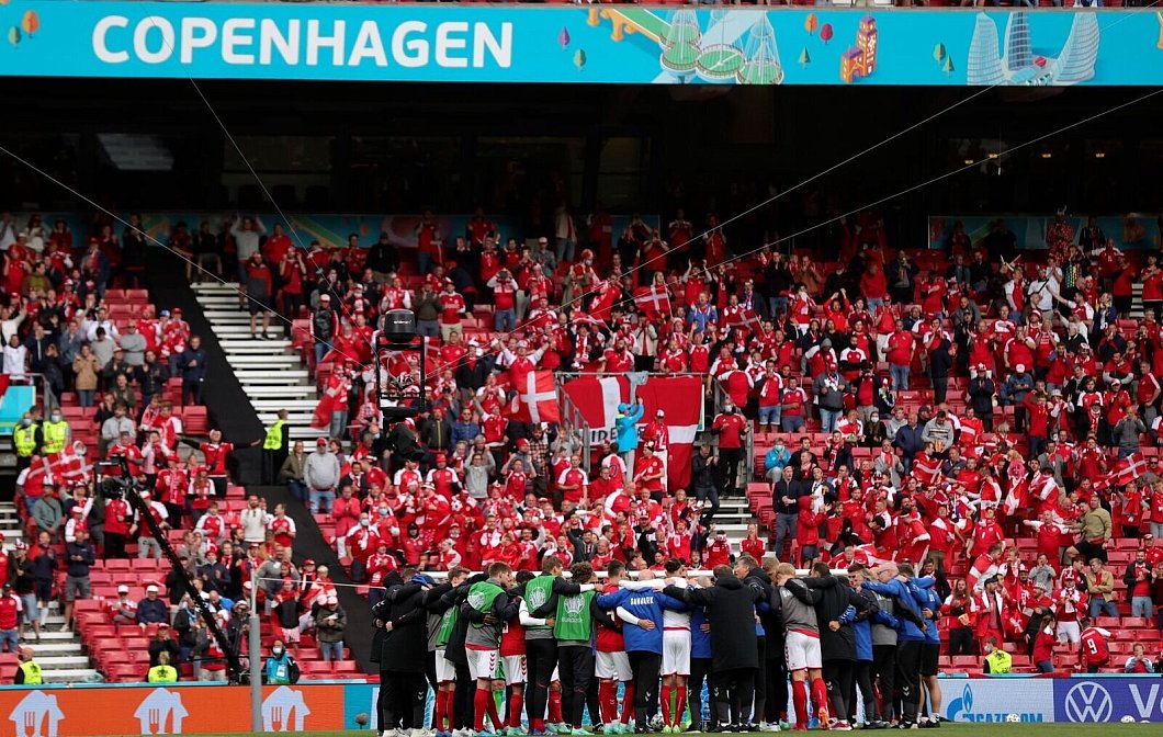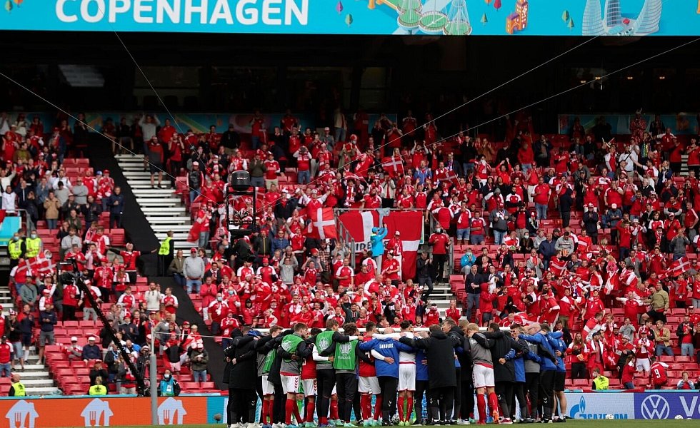 Die dänische Mannschaft schwört sich vor dem Wiederanpfiff ein. - © Friedemann Vogel/POOL EPA/AP/dpa