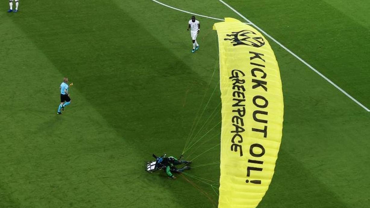 Ursprünglich wollte der Pilot nach Angaben von Greenpeace aus der Luft einen großen gelben Ball in die Arena sinken lassen - als Protest gegen Volkswagen, einen Sponsor der Fußball-EM. Dabei geriet der Motorschirm in eine Stahlseilkonstruktion am Stadiondach und kam ins Trudeln, so dass er in einer steilen Kurve ins Stadion herabsank. Greenpeace entschuldigte sich noch am Abend für die Aktion. Am Mittwoch hieß es, der Pilot wollte gar nicht im Stadion landen, sondern lediglich den Ball ins Stadion schweben lassen.
