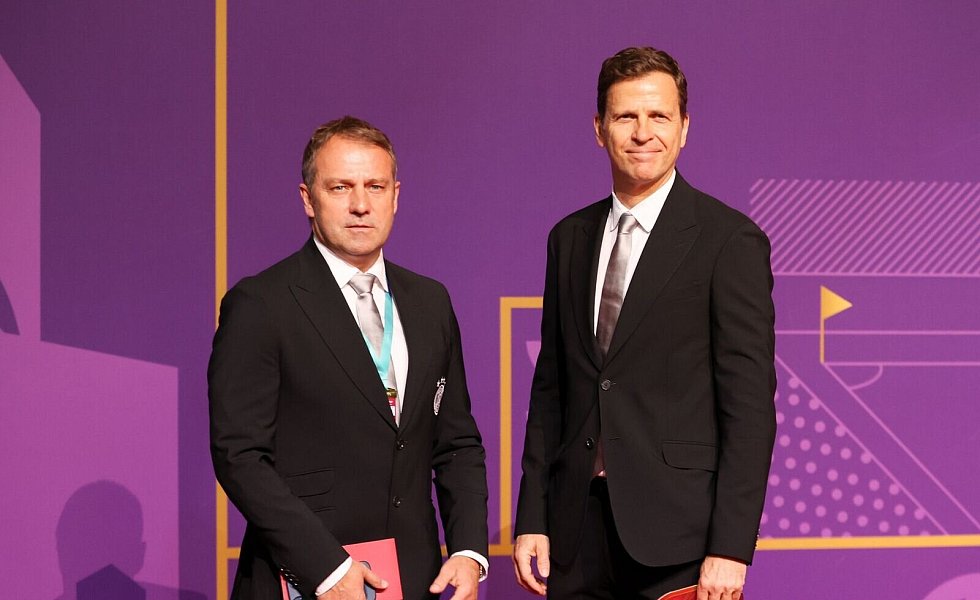 Noch auf der Gala-Bühne traf sich Hansi Flick mit Luis Enrique zum kurzen WM-Plausch. Neben seinem spanischen Kollegen posierte der Bundestrainer für ein gemeinsames Foto und kommentierte danach das Knaller-Los voller Vorfreude.