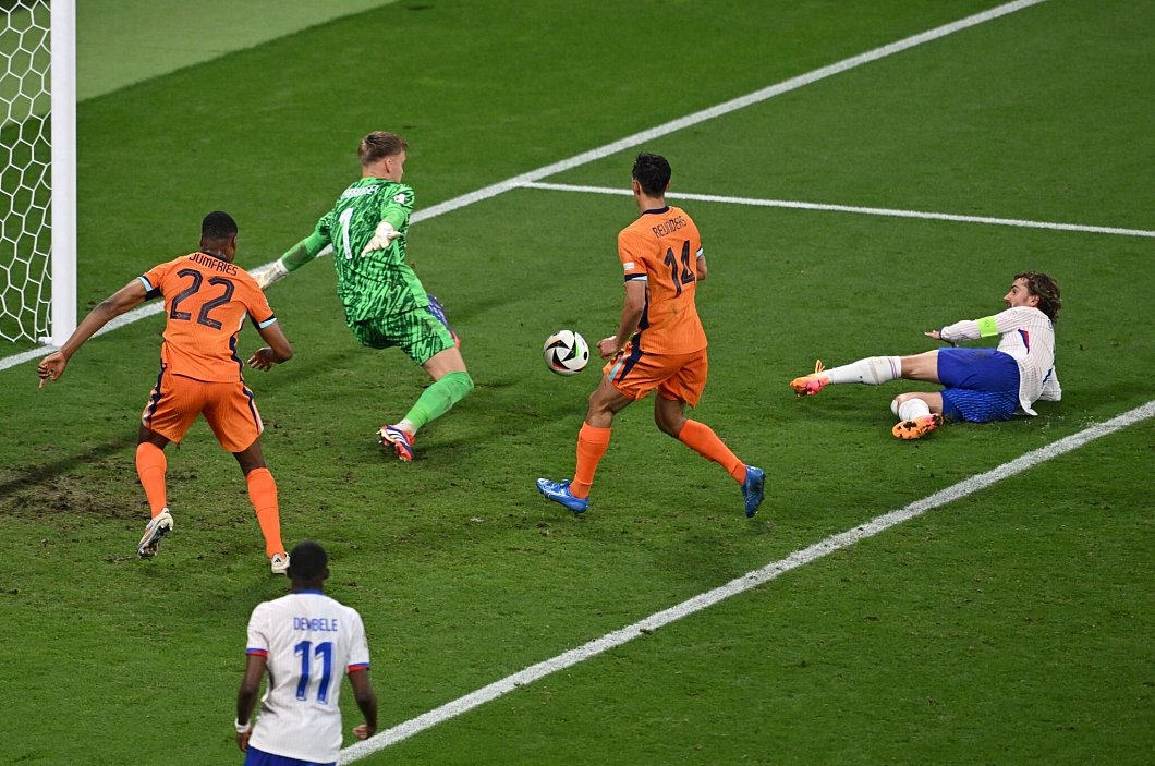 Es blieb turbulent und intensiv - in der Anfangsphase entwickelte sich ein rasantes Spiel mit hohem Unterhaltungswert. Mittendrin immer wieder Griezmann. Zuletzt schon leicht angesäuert, weil er nicht so zentral gespielt hatte, wie er es mag, wirbelte er trotz einer Art Sonderbewachung ordentlich durch die niederländischen Defensivreihen.