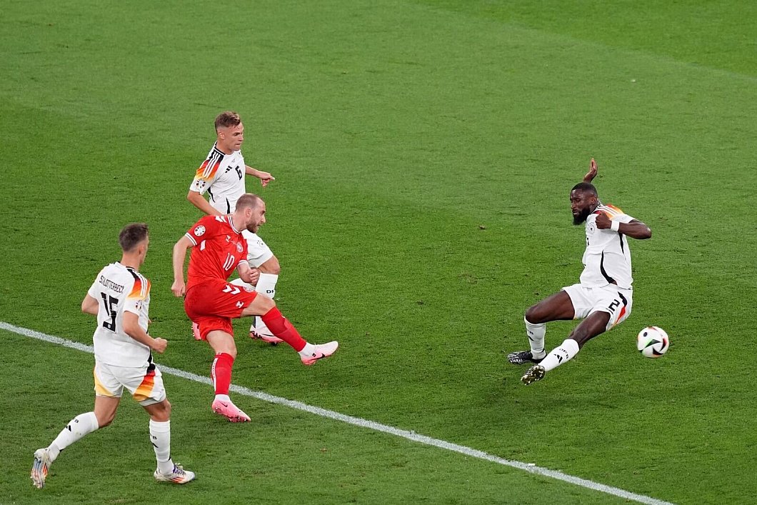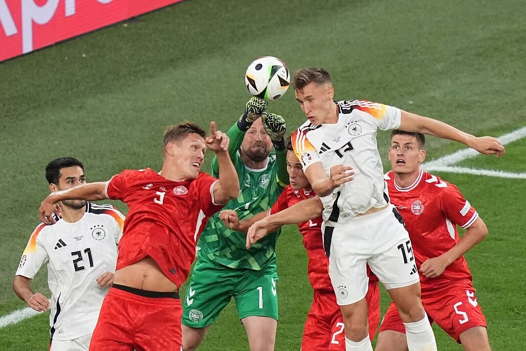Es stand zwar nicht 1:0, die Richtung des Spiels war aber vorgegeben: Deutschland war in den ersten 20 Minuten die deutlich bessere Mannschaft. Die Dänen schafften es kaum aus der eigenen Hälfte und konnten sich bei ihrem Torwart Schmeichel bedanken, dass nicht früh die ersten deutschen Tore fielen. Der 37-Jährige vereitelte Chancen von Kimmich, Schlotterbeck (beide 7.) und Havertz, der einen starken Pass vom rechtzeitig fit gewordenen Abwehrchef Rüdiger zum Abschluss verwertete (10.).